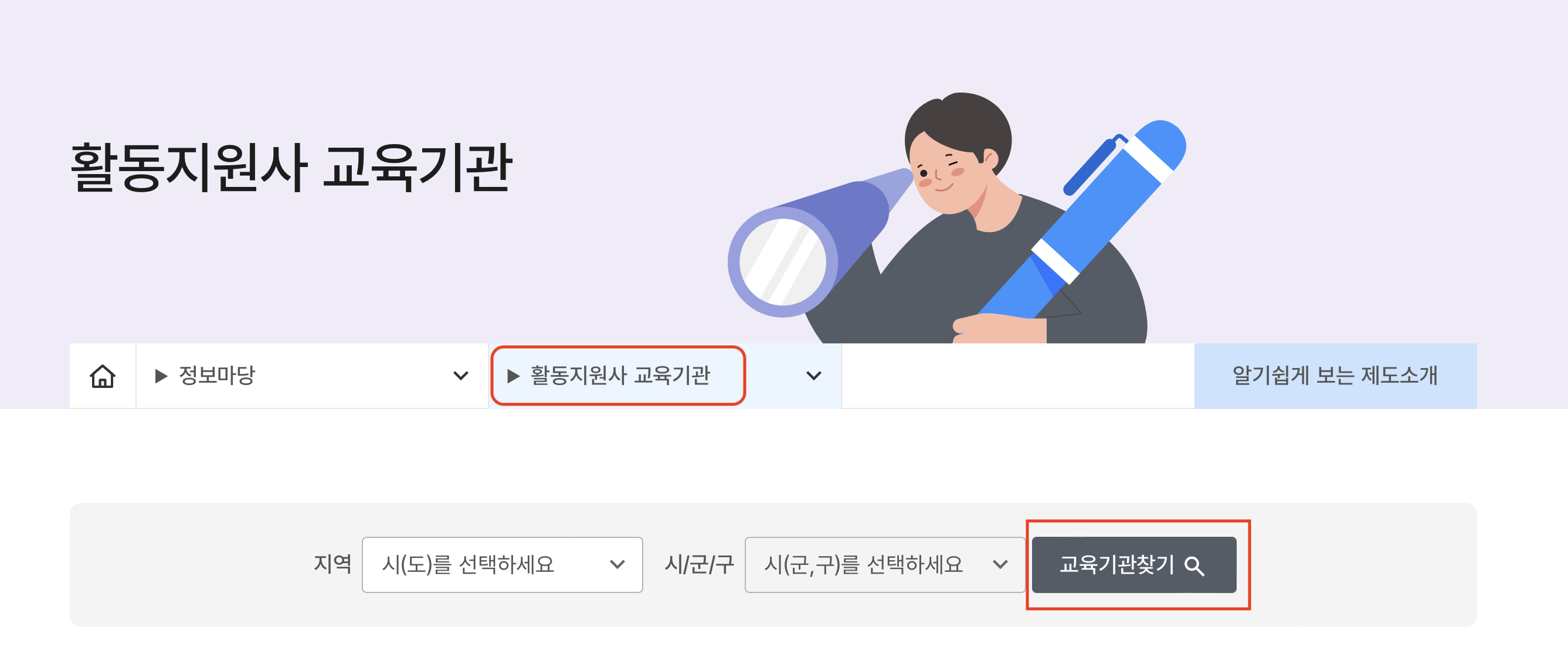 교육기관 조회는 에이블서비스 포털의 “정보마당 → 활동지원사 교육기관” 메뉴에서 시·도 및 시·군·구 단위로 검색할 수 있습니다.
