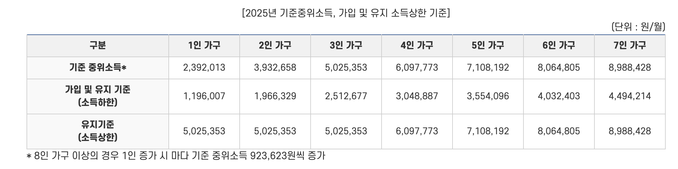 2025년 기준 중위소득 50%는 아래와 같습니다.