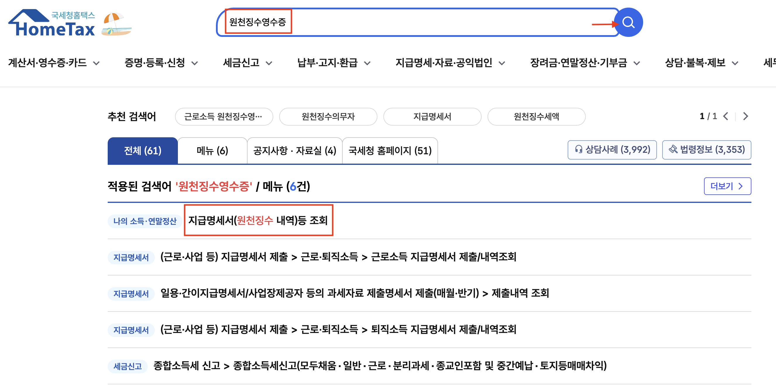* '근로소득 지급명세서 조회'에서 해당 연도 내역 확인