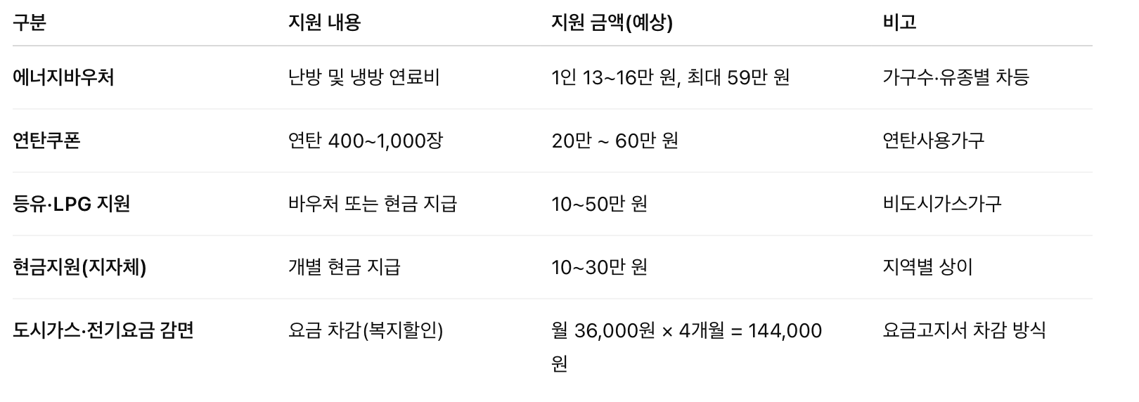 지원 형태는 크게 ▲에너지바우처 ▲연탄·등유 쿠폰 ▲LPG·전기요금 감면 ▲지자체 현금지원으로 나뉩니다.