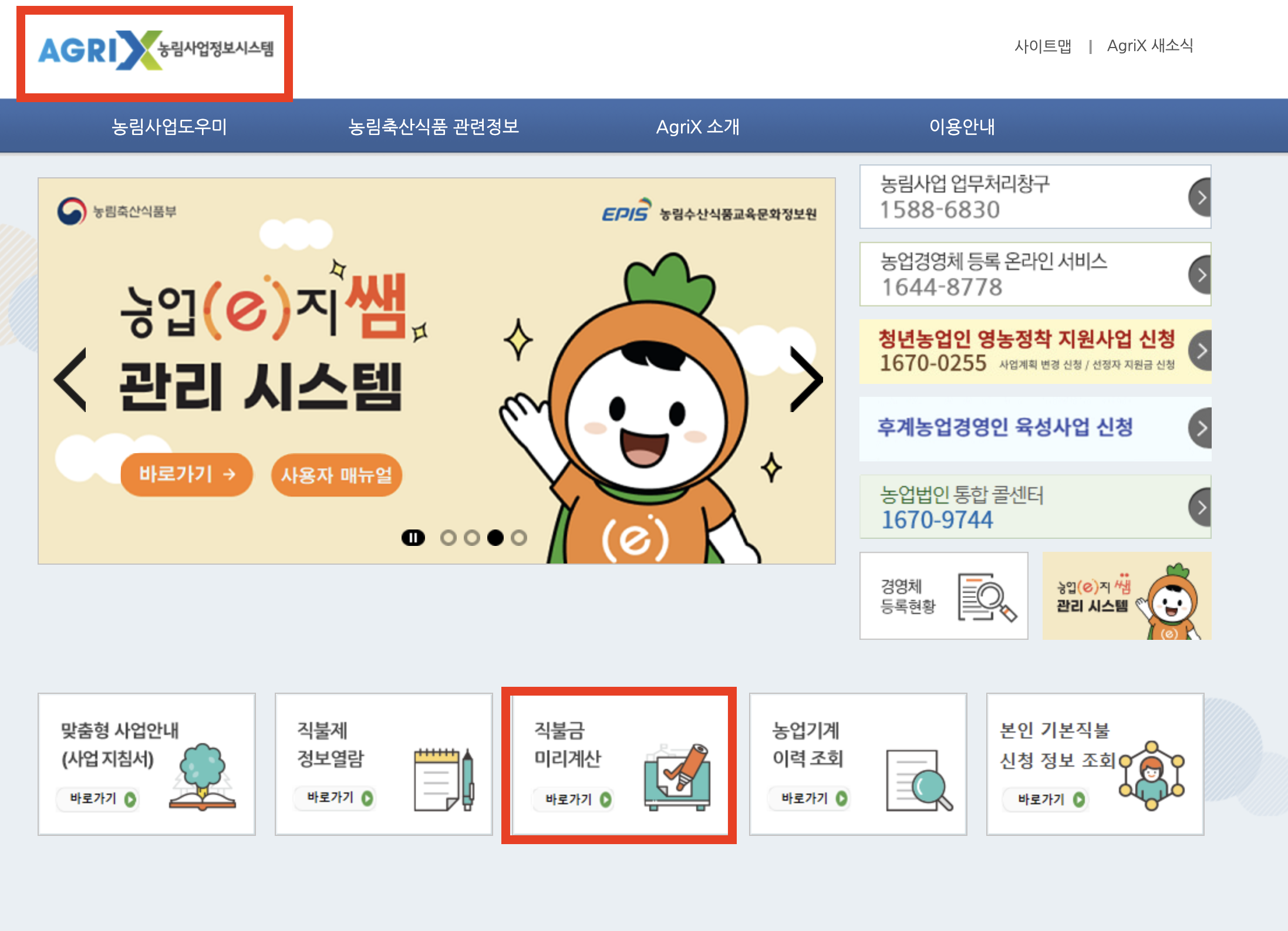 * 메인 페이지 → ‘공익직불금 미리 계산해보기’ 메뉴 선택