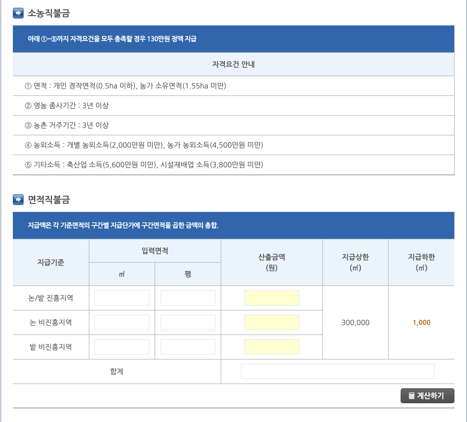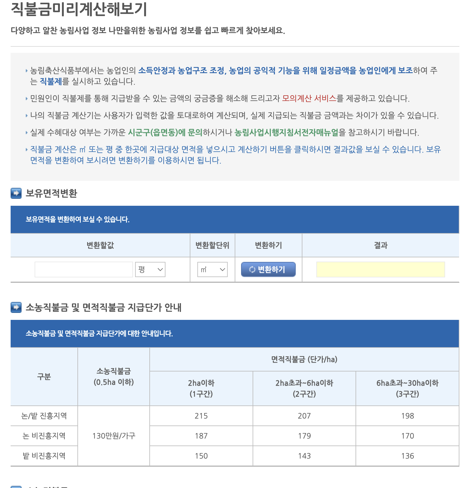 지급금액은 농가 유형별, 면적별, 경작형태별로 차등 적용되며 농림사업정보시스템에서 직불금 금액을 미리 계산해 볼수 있습니다.