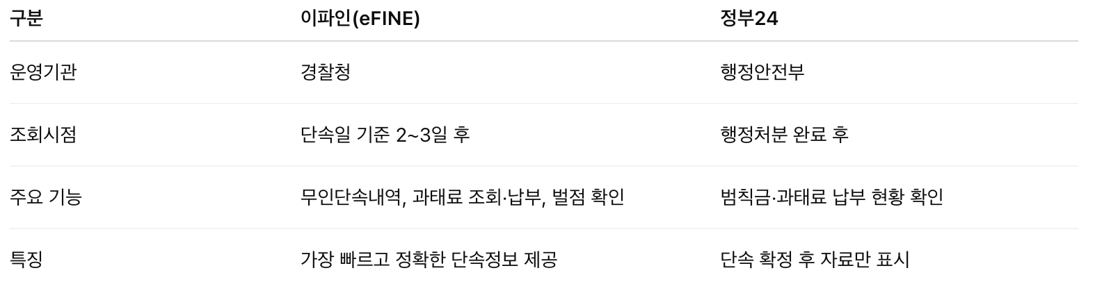 이파인은 실시간 단속내역을 가장 먼저 확인할 수 있는 시스템이며, 정부24는 행정 처리 완료 후 결과를 확인할 때 활용됩니다. 따라서 두 서비스를 병행하면 단속부터 납부까지 모든 과정을 효율적으로 관리할 수 있습니다.