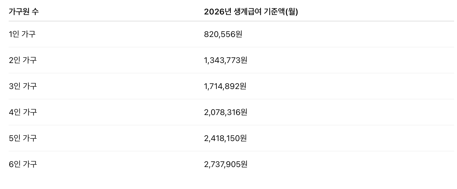 2026년 생계급여는 가구원 수에 따라 ‘선정기준액’이 정해지며, 이 금액이 곧 월 최대 지급 가능 금액입니다.