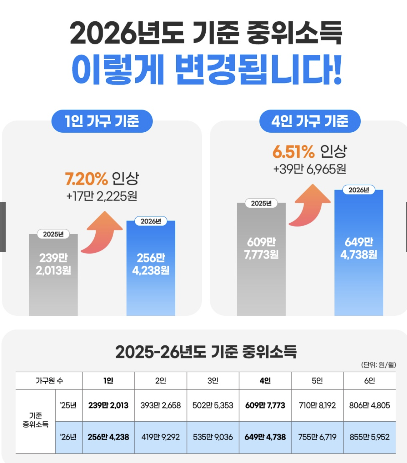 2026년도 기준 중위소득이 역대 최대 수준으로 인상되면서, 각종 복지제도와 지원사업 전반에 상당한 변화가 예상됩니다.