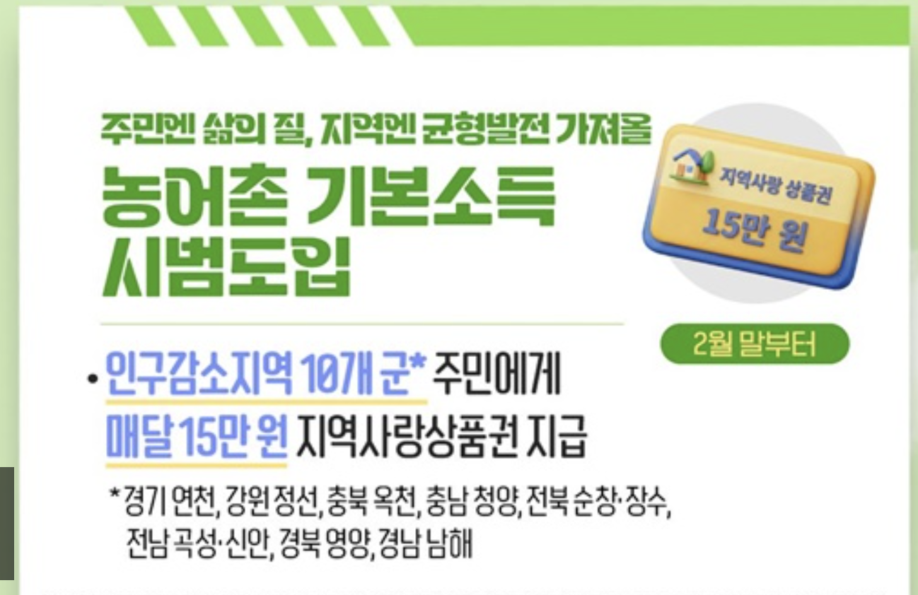 2026년 2월 말부터 시범지역 주민에게 매달 15만 원이 지역사랑상품권으로 지급됩니다.